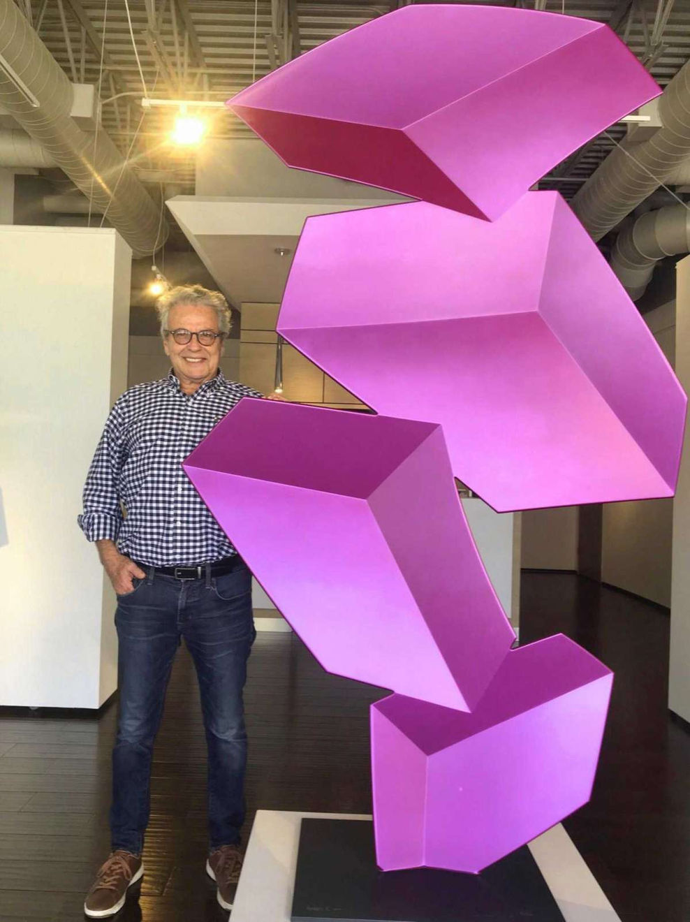Elementary drawing students learn to play with perspective like this, but achieving the illusion in space, with meticulously welded, hand-lacquered steel, is no child’s play. Barrios’ paint technique is part of it. He balances transparent paint with a mix of tints (which dissolve in the medium) and essences (which float), to achieve light-grabbing gradations of color over a base of silver or white.